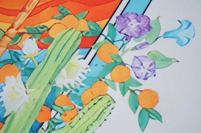 Camisa blanca L'Arche Fleure de Casablanca con un estampado floral divertido, confeccionada en sarga de seda con la estructura cuadrada característica de la marca y completa con un cuello cubano.