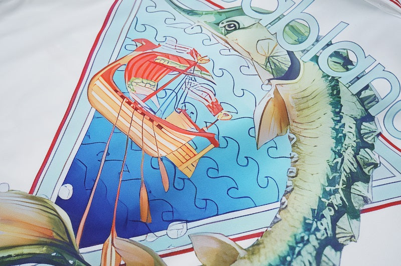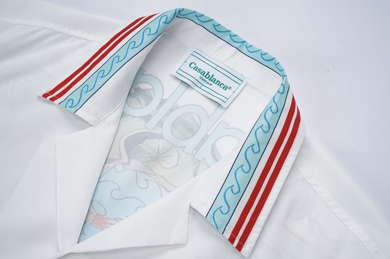 Camisa blanca L'Arche Fleure de Casablanca con un estampado floral divertido, confeccionada en sarga de seda con la estructura cuadrada característica de la marca y completa con un cuello cubano.
